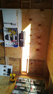 Ok, so I'm a few days late in getting this moment of celebration posted here, but we now have a fully functioning solar power system! It went live on Monday and has been functioning beautifully since. We have now regained use of an actual refrigerator and freezer and we can use normal outlets again. We discovered that our battery bank is undersized for our solar panels, so we are losing a fair chunk of their production each day once the batteries are full. At some point in the future, we will likely upgrade the batteries to higher amp hour ones to correct that, but for the moment we're doing fine.